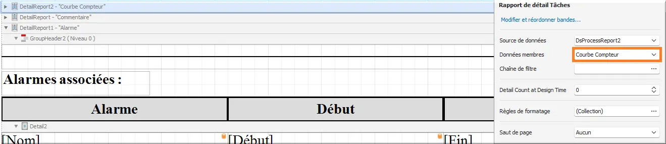 Dans l’édition du rapport, accéder aux Propriétés d’un bloc DetailsReport :